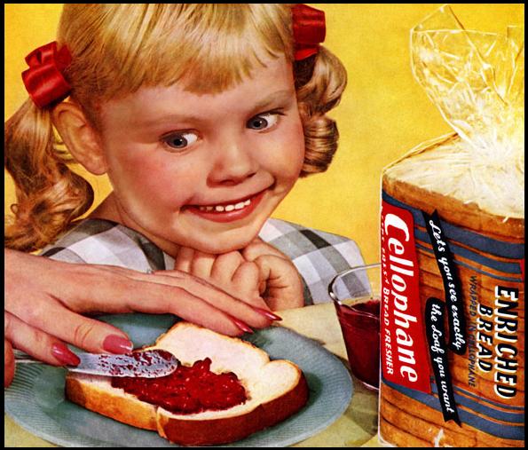 If Van Camps 'Boy Beelzebub' got you freaked a few days ago, here's his evil twin sister, Cellophane Jane The Cellophane Bread Girl of 1954. The poor mother's probably regretting her night in a Bangkok back-room under a lad named Lucifer every time she makes lunch for this Satanic Shirley Temple. And while we're supposed to believe that's jelly she's spreading, it sure looks a lot like pork and beans to us! Well, that, or judging by the gleam in Jane's eyes, someone's entrails. Mm-mm...sandwich...